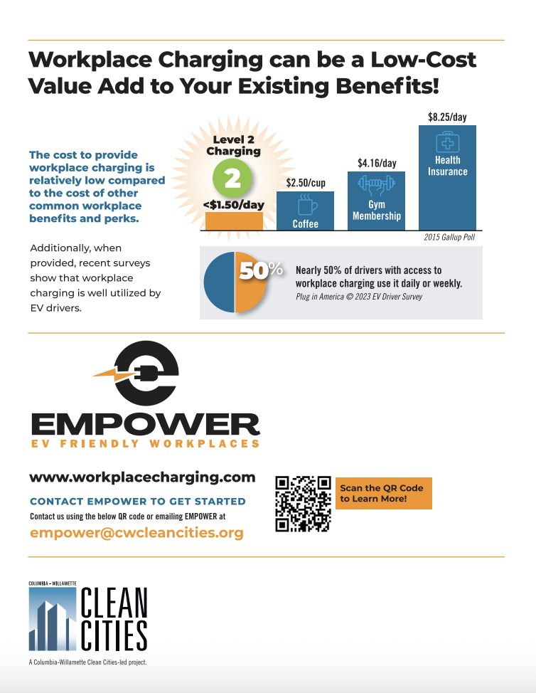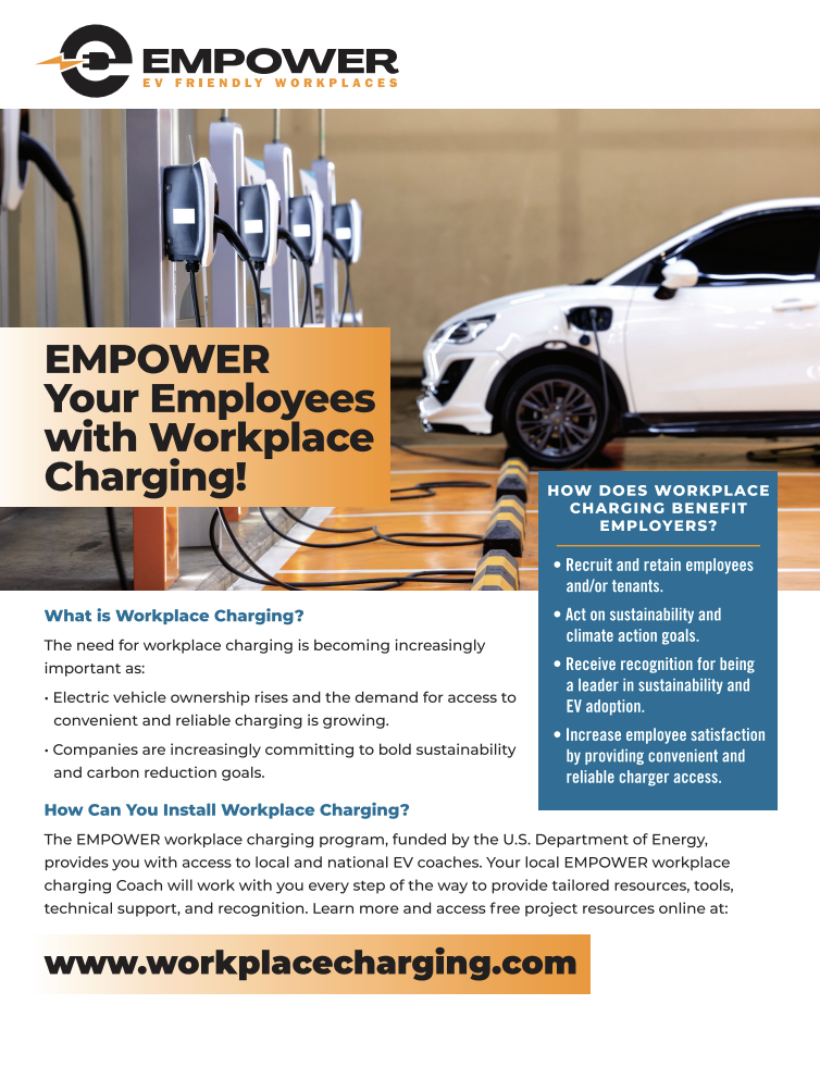 Workplace charging can provide a variety of benefits to your organization, adding value and increased employee engagment within your workplace. Learn more about workplace charging by viewing resources on EMPOWER’s website.