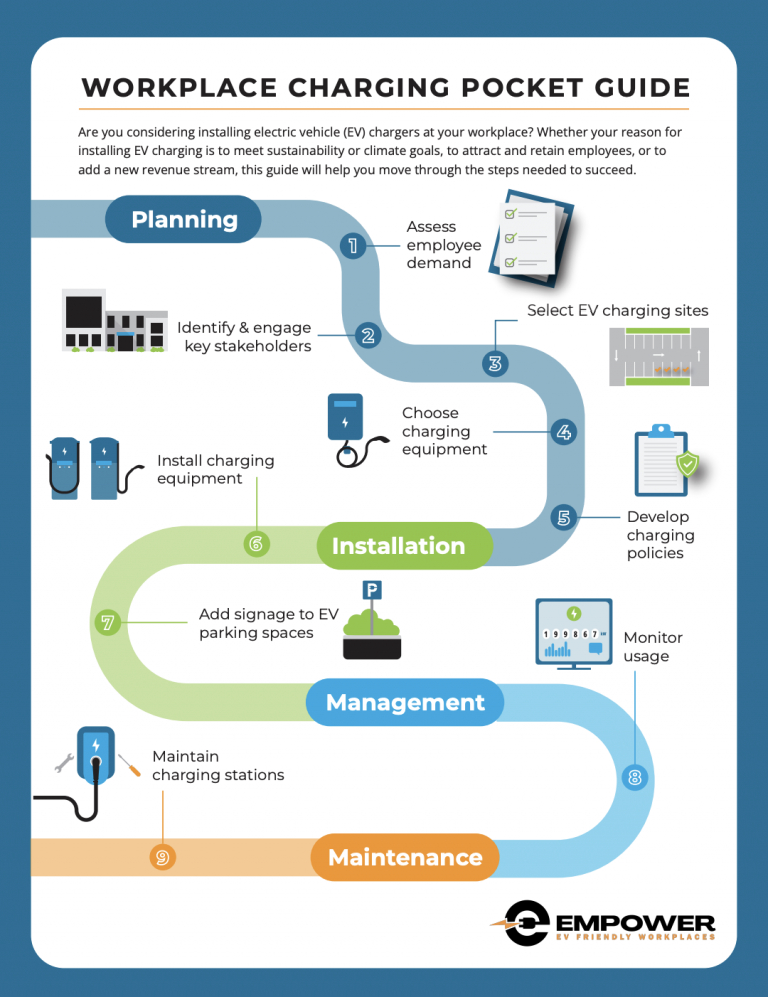 If you are considering installing chargers at your workplace, the Workplace Charging Pocket Guide is essential to understanding the key steps involved in successfully implementing this infrastructure.Â