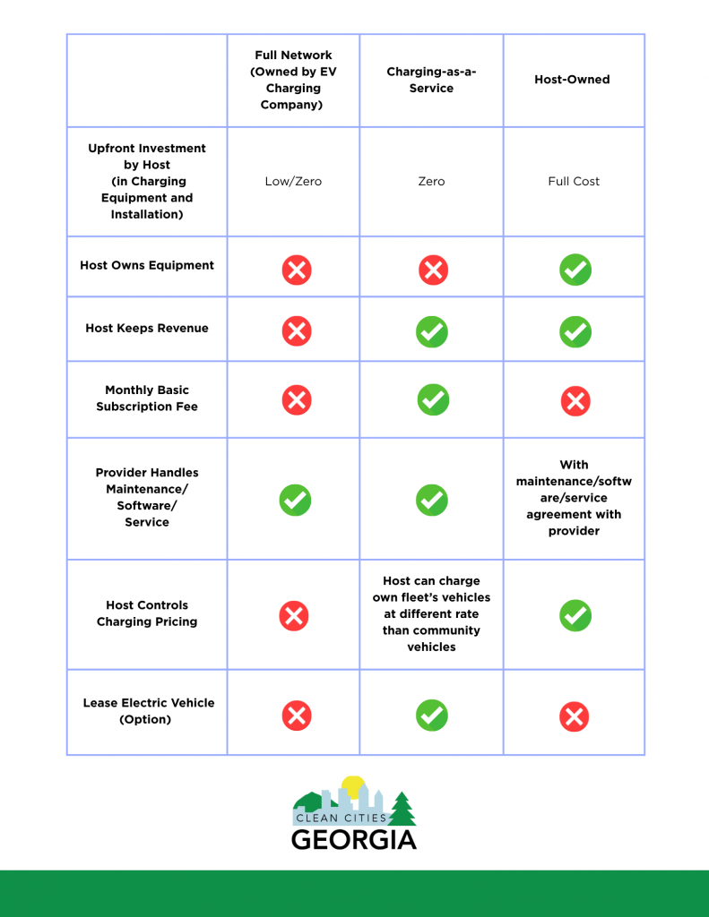 There are three main options to choose from if you decide to install chargers in your workplace. Clean Cities Georgia developed a comprehensive one-pager, including the options and benefits of each installation option. This flyer will help you understand which workplace charging model would be the best for your company.